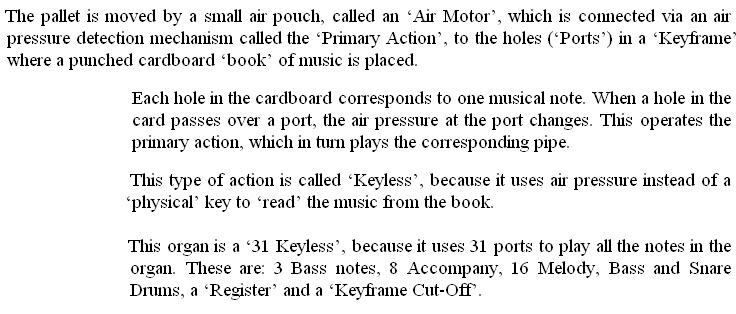 A: It uses compressed air from a ‘Blower’ to play tuned pipes.