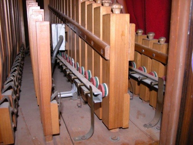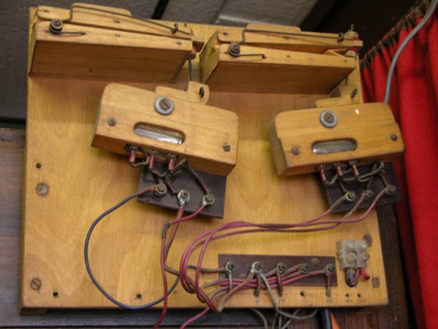 The lighting controller mechanism in Decap organ 'Lucy'. The swiveling blocks contain mercury switches, which are activated by air motors, controlled by the organ's registers. These operate lights hidden inside the organ front.