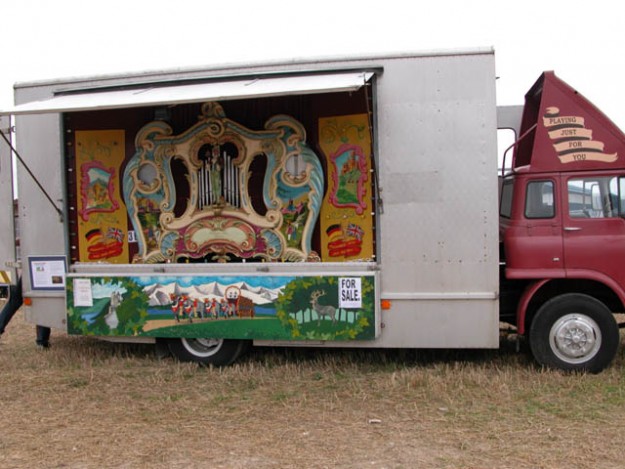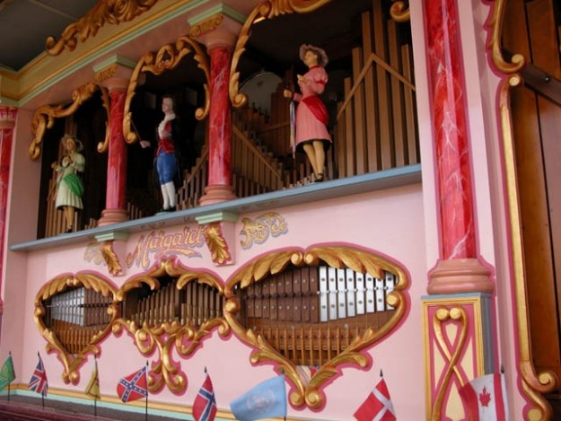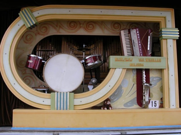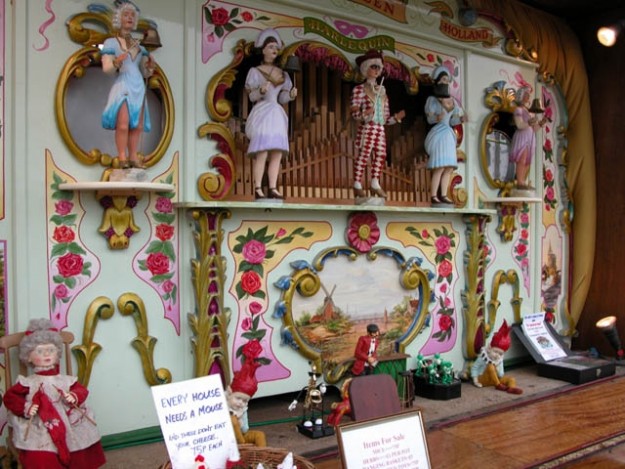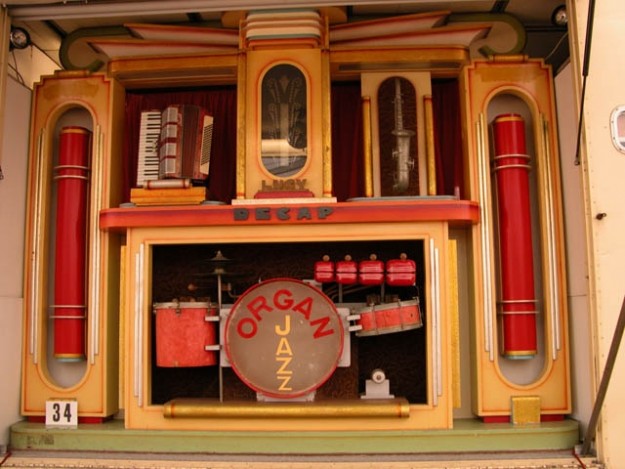 Decap organ 'Lucy' in the marquee. Note the original coin box, which would have tripped the organ to play from a continuous book of music when the organ was incorporated into a cafe.